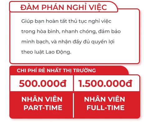 Dịch vụ đàm phán nghỉ việc là dịch vụ thay mặt khách hàng truyền đạt ý định nghỉ việc đến công ty của bạn, nhằm đảm bảo bạn nhận được toàn bộ quyền lợi và nghỉ việc suôn sẻ.